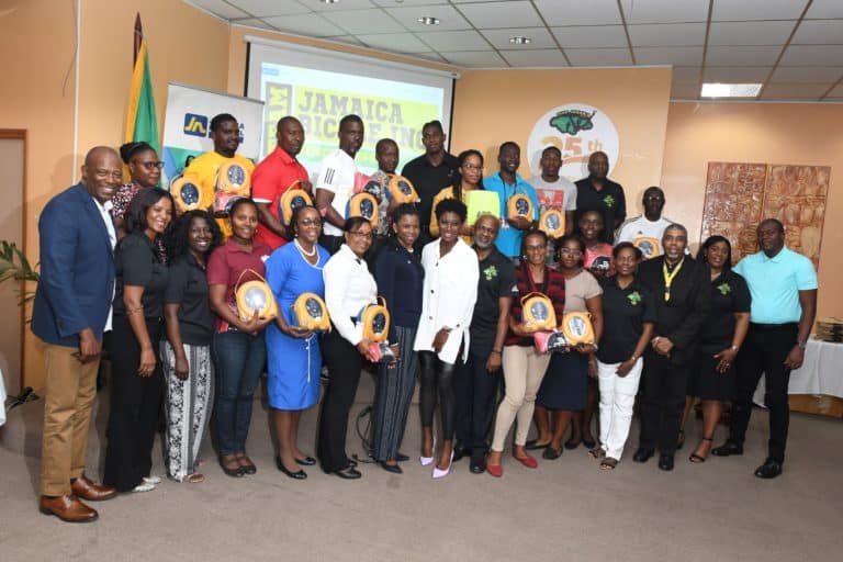 To mark 25 years of service to Jamaica’s athletes, Team Jamaica Bickle (TJB) made a commitment to donate 25 Automated External Defibrillators (AEDs) to schools in 2019 under its “Defibrillator to Schools” program. The organization was however able to donate 35 units, 10 more than planned through the help of kind sponsors. Thirteen (13) high schools; Annotto Bay, Claude McKay, Foga Road, Glengoffe, Glenmuir, Jose Marti, Holmwood Technical, Holy Childhood, Holy Trinity, Kellits, Ocho Rios, Robert Lightbourne, and William Knibb; The National Stadium and The University of the West Indies (UWI) Sports Department were presented with units for a total of 15 and over 50 persons trained in use of the machine and basic CPR. The presentation took place on Friday November 15, 2019 at the JAMPRO Auditorium in Kingston. Twenty (20) units were presented earlier this year to schools in Western Jamaica.